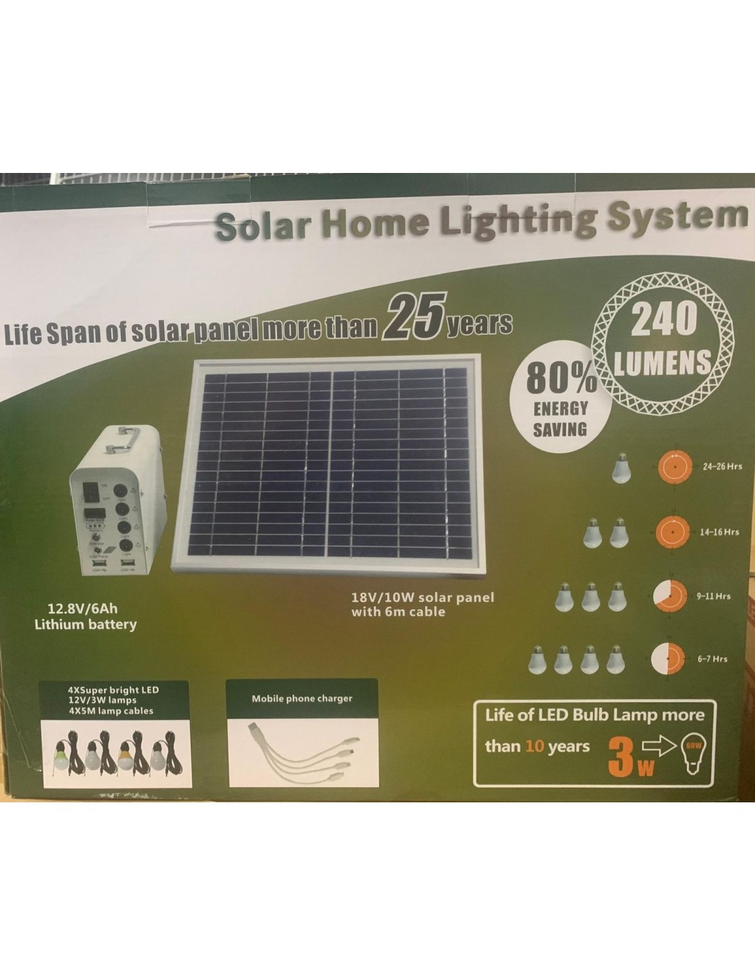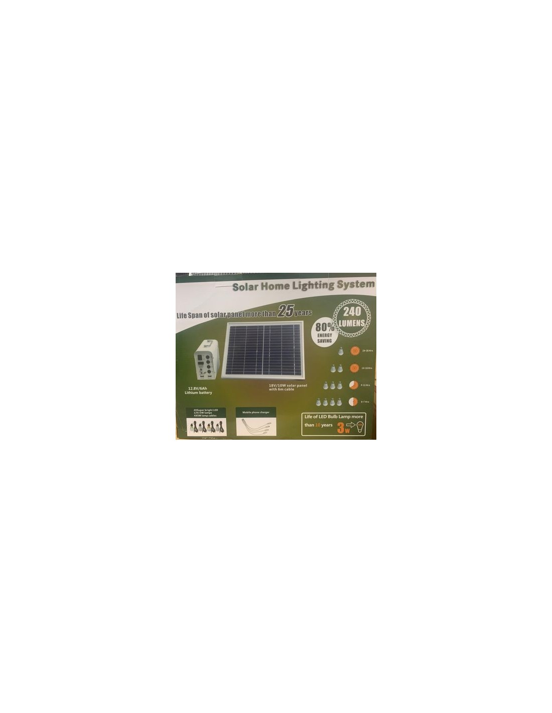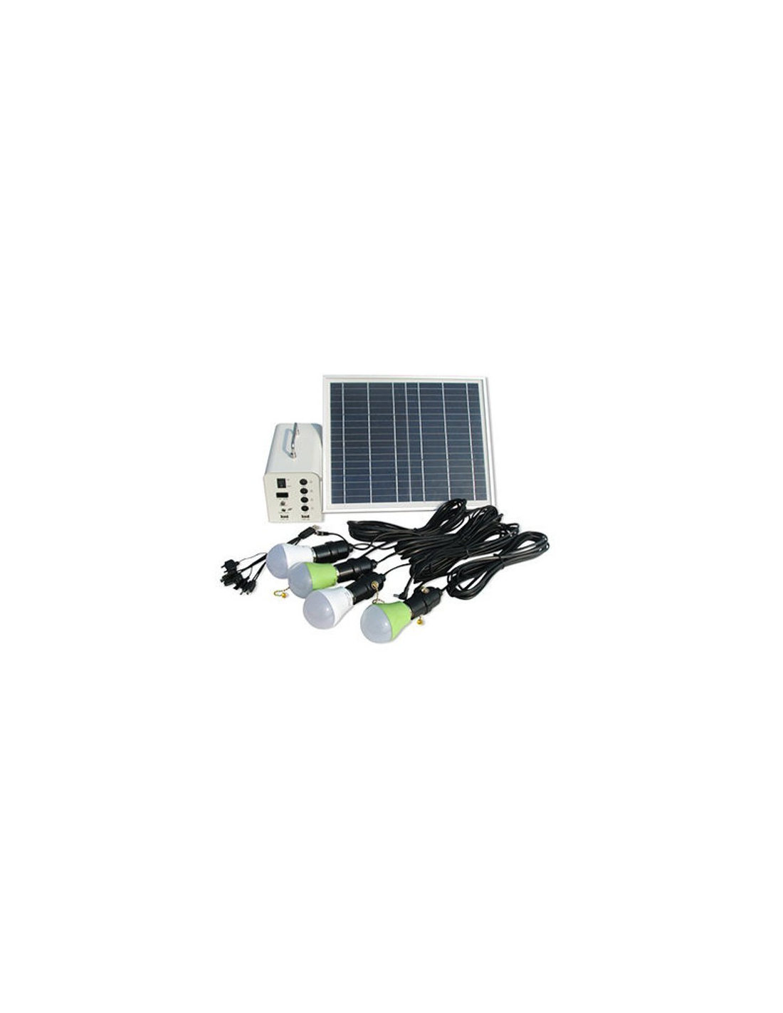 Con batería litio 6ah 76.8wh. Panel 20w, controlador 5A, cable para panel solar, iluminación led 4 und con cable, USB 5 puertos, fusibles protección, interruptor ON-OFF.